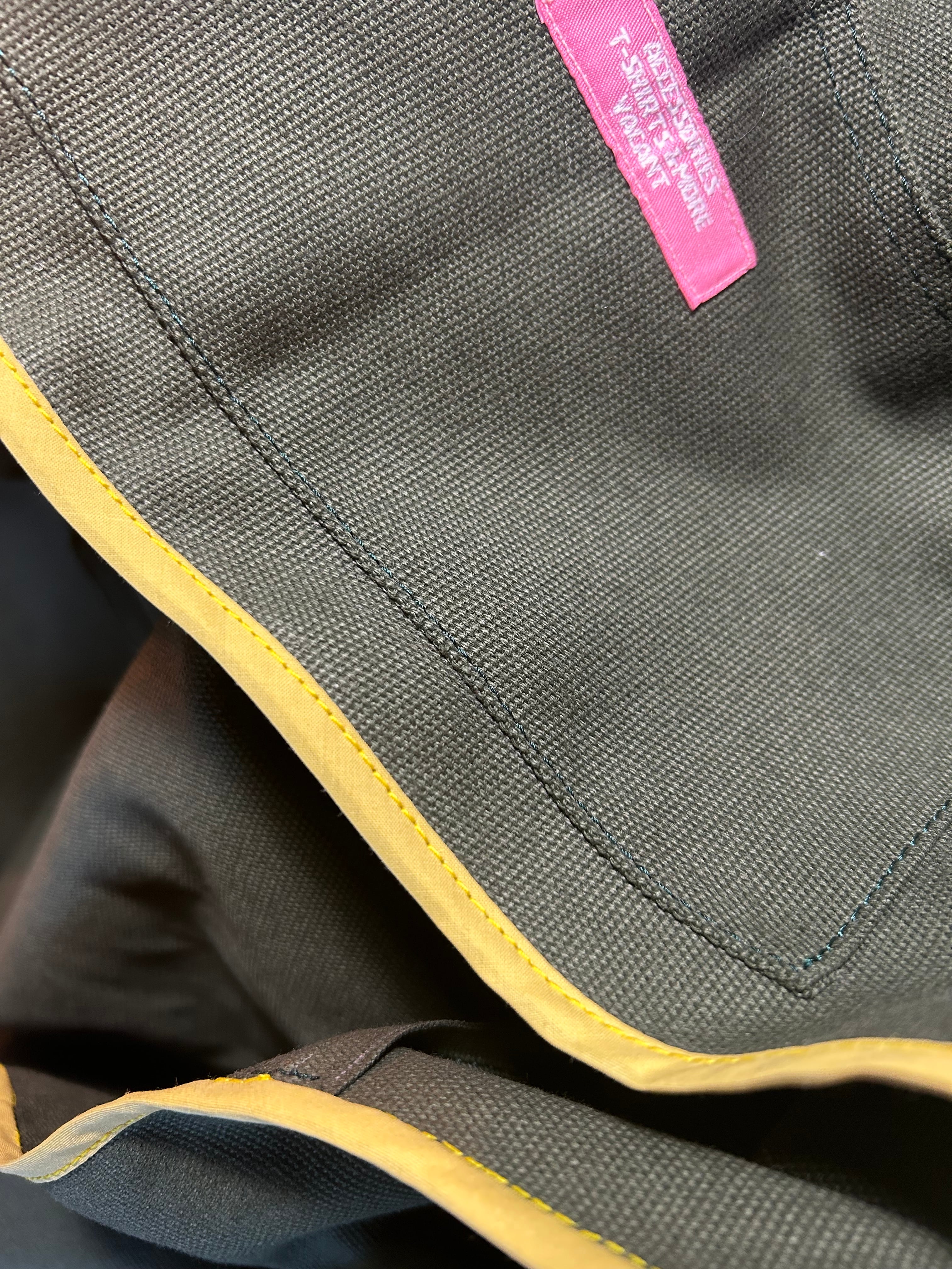 ビニール感のある塗装により、多少の防水効果もございます。水気で色落ちする事はなく、生地のハリもお使い頂くうちに徐々に馴染んまいります。