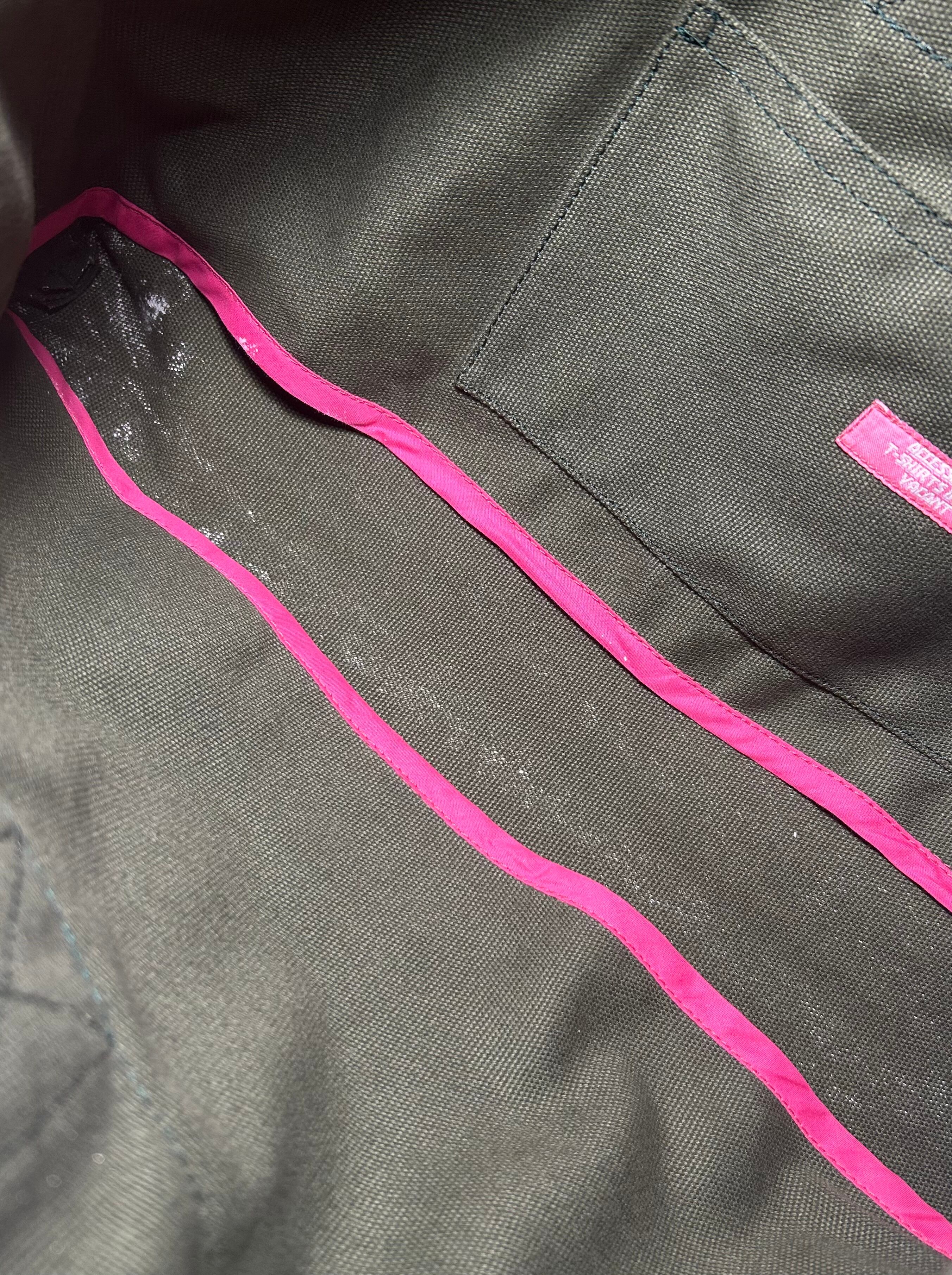 塗装によりビニール感のある質感となっており、多少の防水効果もございます。水気で色落ちする事はなく、生地のハリもお使い頂くうちに徐々に馴染んまいります。